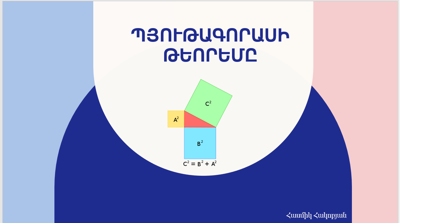 Պաշարը նախատեսված է 8-րդ դասարանի երկրաչափության դասընթացի Պյութագորասի թեորեմի ուսուցման համար, որում ներառված են կրկնության հարցեր, պատմական ակնարկ, նոր նյութի հաղորդում , իսկ դասը առավել ակնառու դարձնելու համար կօգնի 7 -րդ սահիկում առկա է հղումը, ինչպես նաև ներկայացված են խնդիրների լուծում։