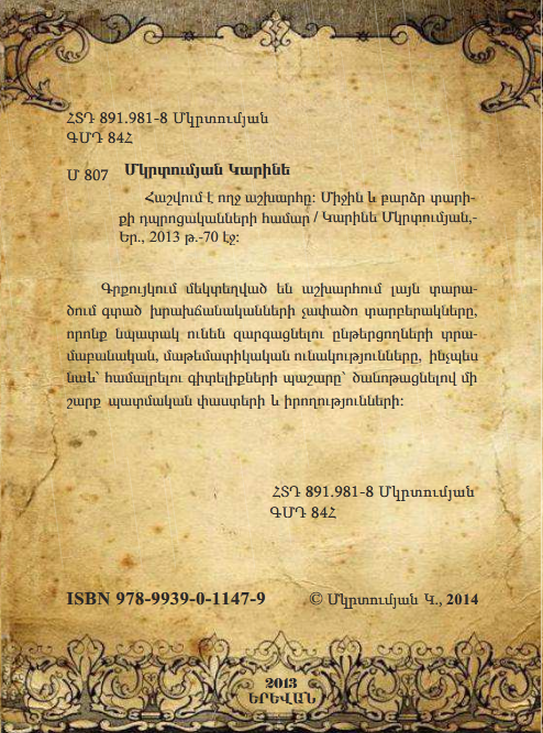 «Հաշվում է ողջ աշխարհը» խորագիրը կրող եռհատորյակը ներառում է լավագույն մասունքները ոչ այնքան հայտնի խրախճանականների, որոնք թևածում են ողջ աշխարհում, բայց դեռևս անծանոթ են հայ ընթերցասերներից շատերին: Հունական, հնդկական, եգիպտական, պարսկական, քրդական, իսպանական, ֆրանսիական, ռուսական, և, իհարկե, հայկական հատընտիր խնդիր-բանաստեղծությունները կհետաքրքրեն բոլորին: Նրանց նպատակն է զարգացնել ընթերցողների ոչ միայն մաթեմատիկական ունակություններն ու վերլուծական մտածելակերպը, այլև ծանոթացնել պատմական որոշ իրադարձությունների, այս կամ այն դեպքի հետ կապված փաստիրողությունների: Միով բանիվ, ներկա ժողովածուն ունի ճանաչողական մեծ նշանակություն, նորանոր գիտելիքներ ուսուցանելու հնարավորություն: