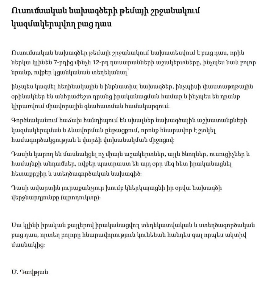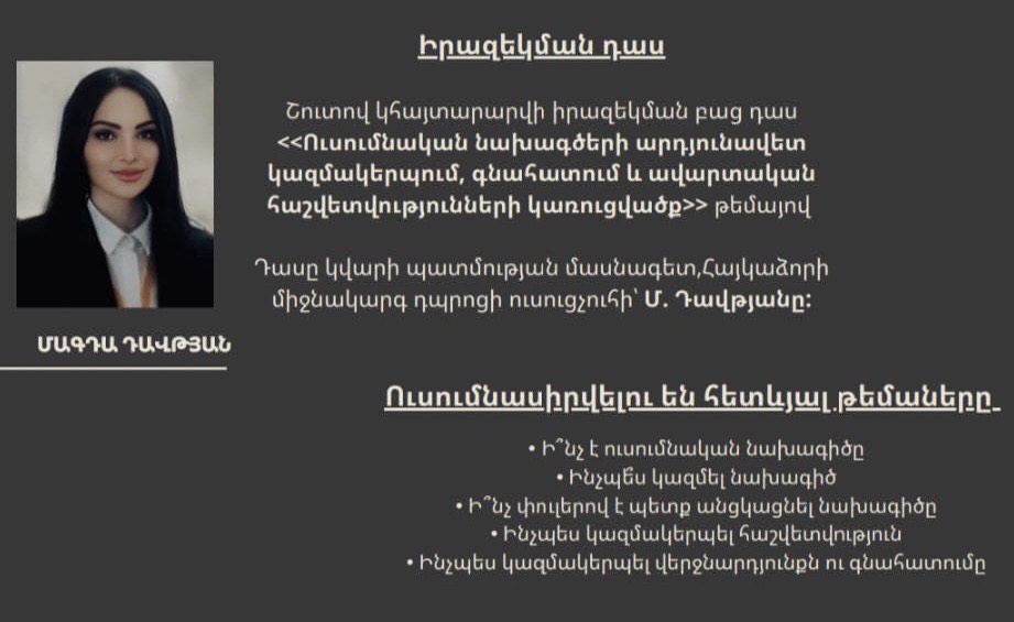 Թեմայի շրջանակում իրազեկել նախագիծ վարողներին ։Դասի ընթացքում կիրազեկվեն ,թե ինչ է ուսումնական նախագիծը,ինչպես կազմել ուսումնական նախագիծ և ինչպես տալ վերջնական հաշվետվություն ։